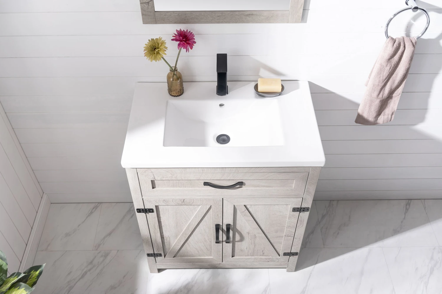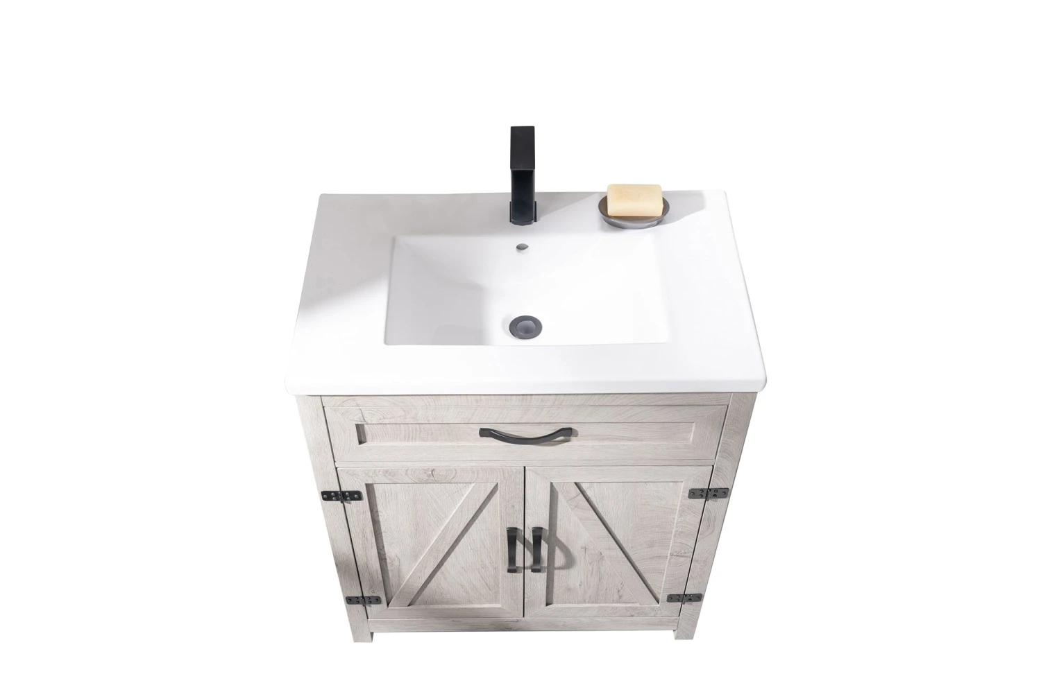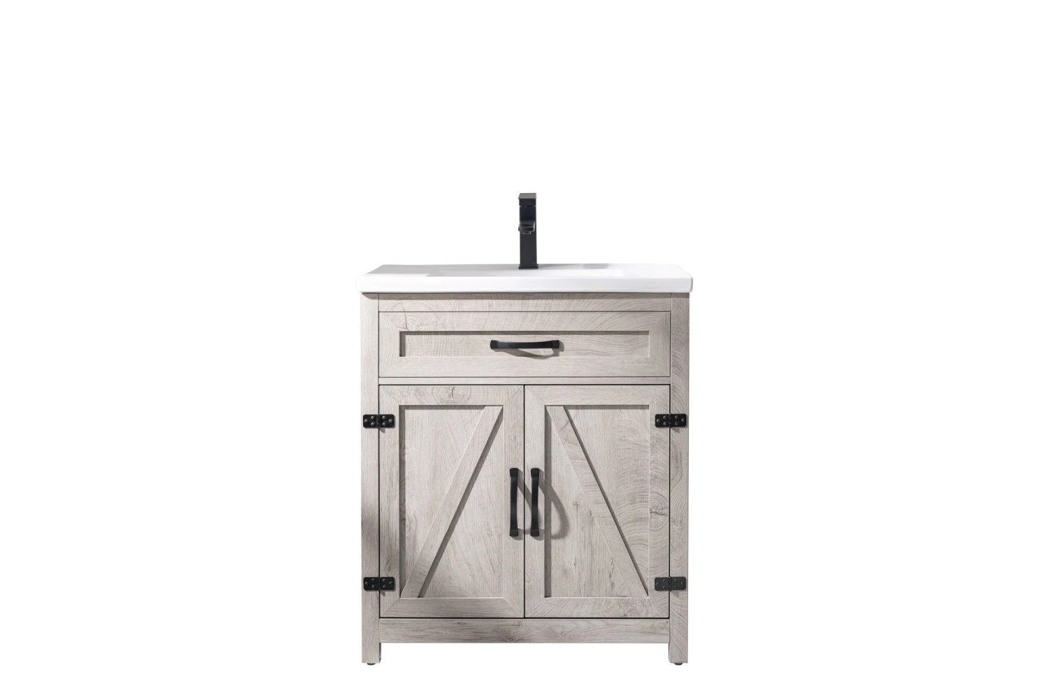 - Elevate your bathroom with style and functionality with this sleek Modern Farmhouse design single bathroom vanity set. Topping off the design is a European inspired integrated porcelain sink and countertop combination with pre-drilled single faucet hole. This bathroom vanity comes with a Gray-Washed wood grain color, one of the trendiest look around.  Assembly Required. Â
