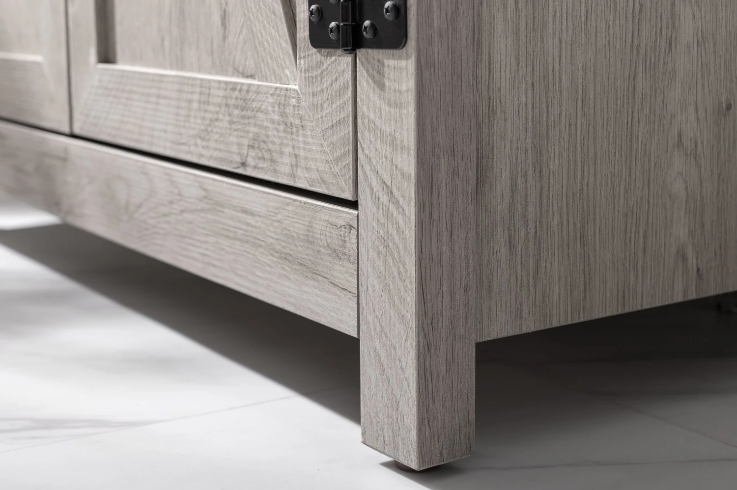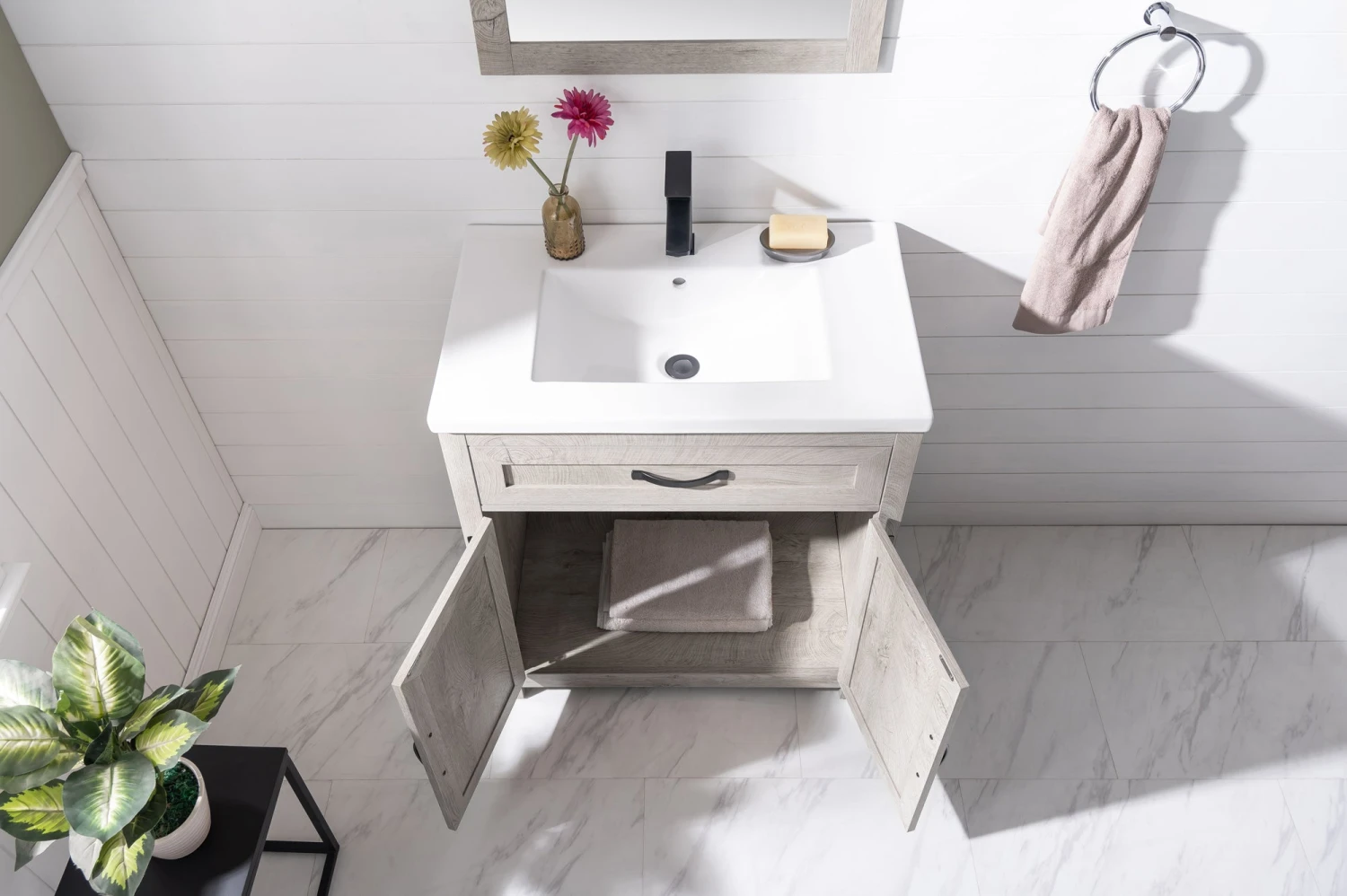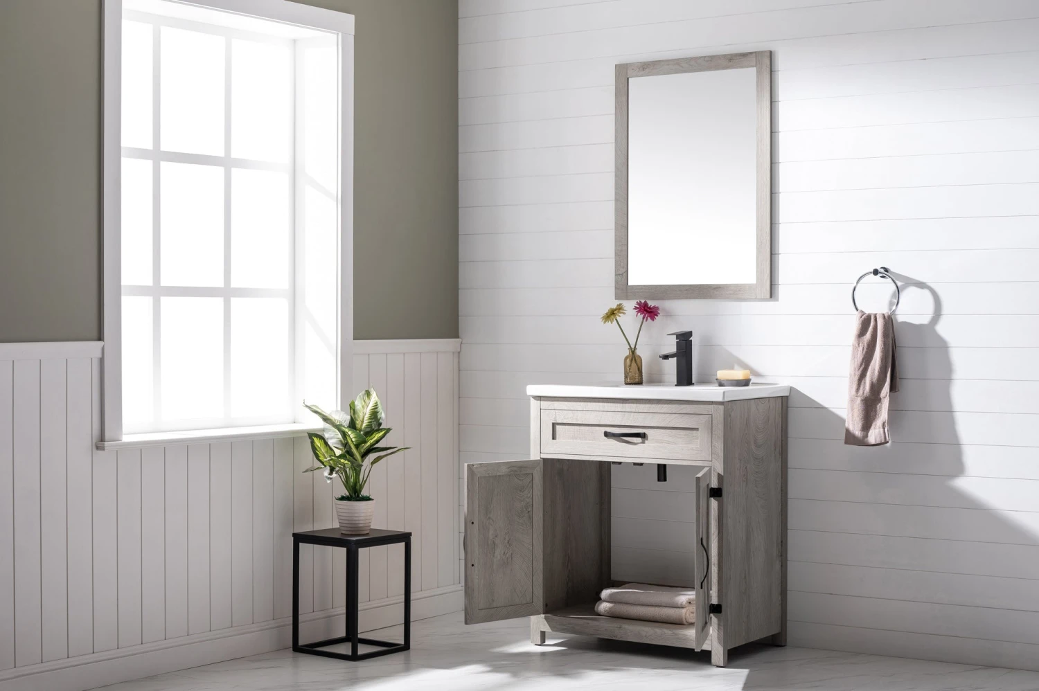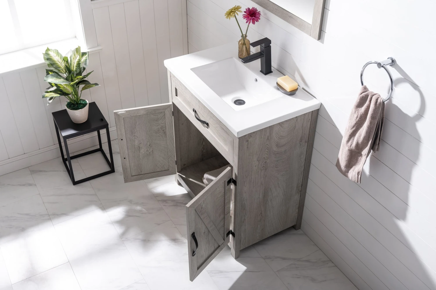 - Elevate your bathroom with style and functionality with this sleek Modern Farmhouse design single bathroom vanity set. Topping off the design is a European inspired integrated porcelain sink and countertop combination with pre-drilled single faucet hole. This bathroom vanity comes with a Gray-Washed wood grain color, one of the trendiest look around.  Assembly Required. Â