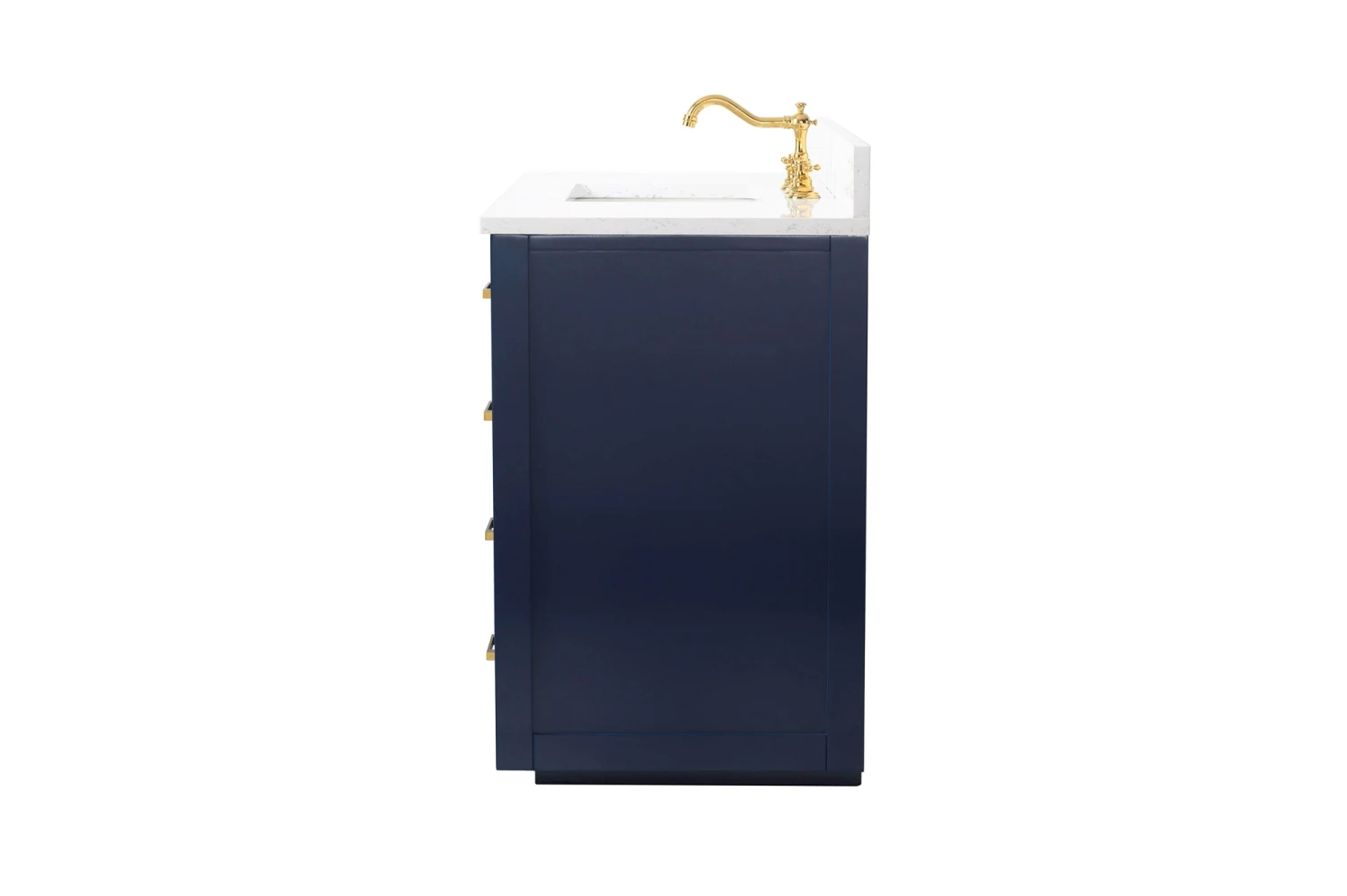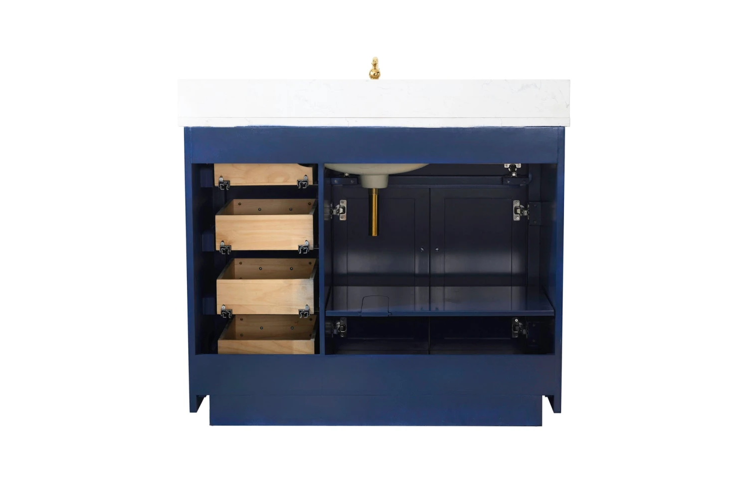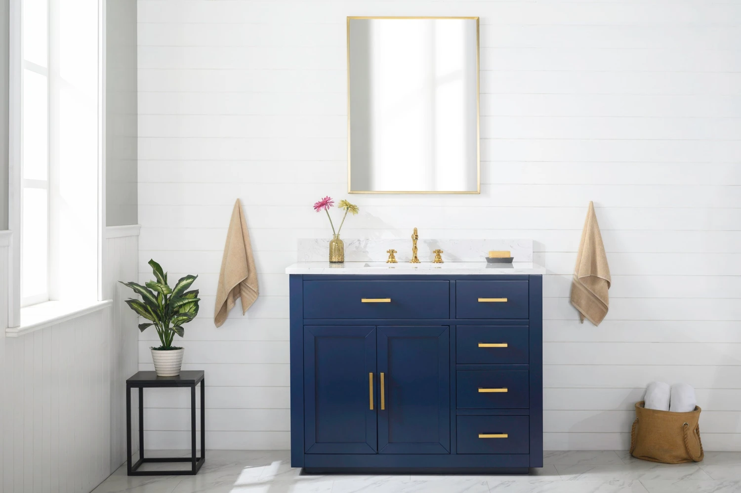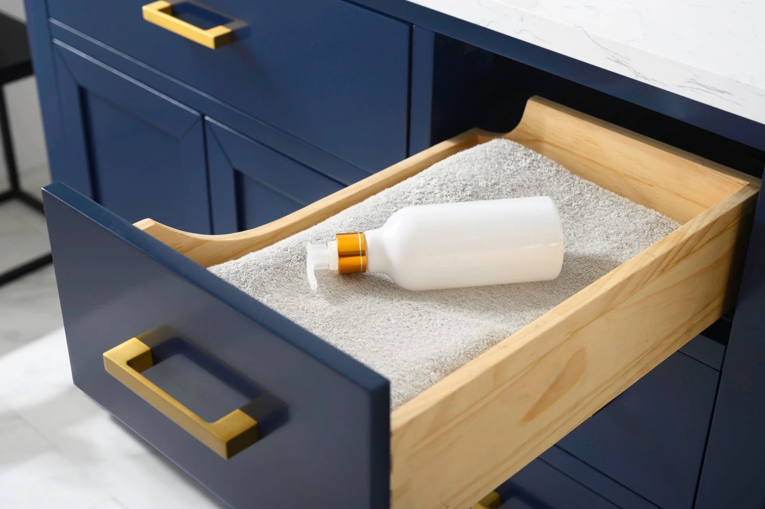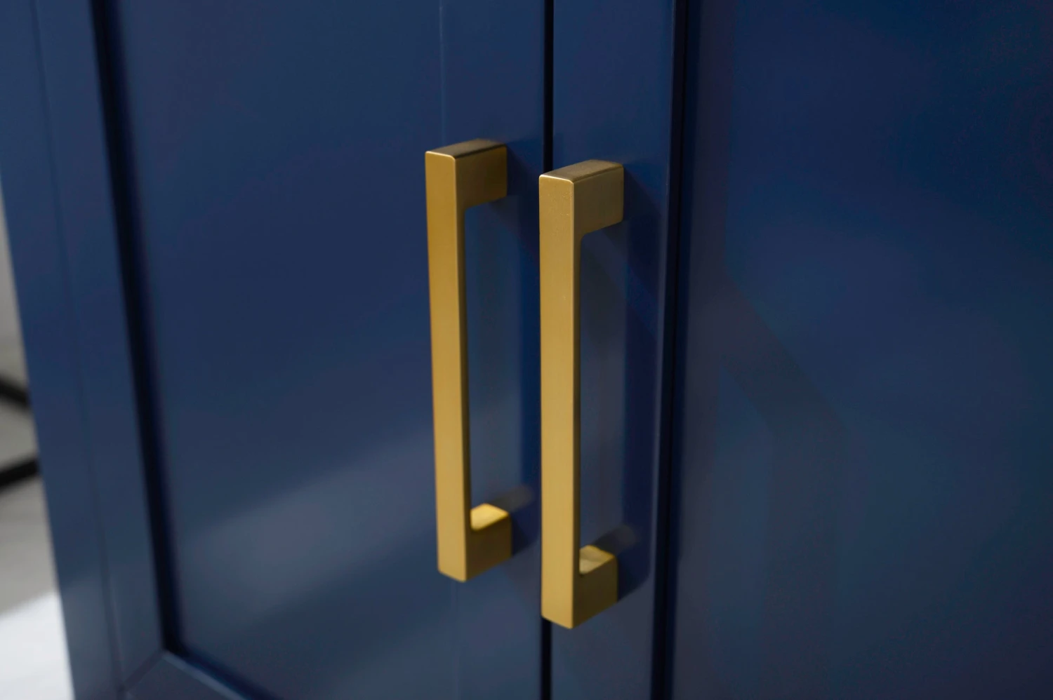 - The Grace Bathroom Vanity Collection was inspired by the 1950’s era minimalist design that captures clean lines, crisp geometry and contrasting use of mix material and color pertaining to that period. Premium quality construction detailed with a rich Navy Blue color, meticulously handcrafted and hand finished. Designed with a Plinth Base that creates an illusion of a floating effect. Features brushed gold hardware, dovetail joints and many higher-end options. Available in 42”, 48” and 60”