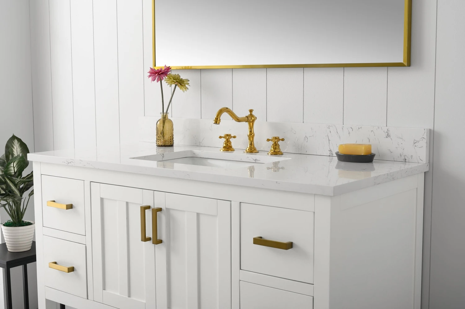 - The Henry Bathroom Vanity Collection was inspired by modern design with sleek clean lines and cozy aesthetics. Premium quality construction with skillfully handcrafted finish. Features Brushed Gold hardware, dovetail joints, soft-closing drawers and doors, and many higher-end options. Available in 42″, 48″ and 60″.