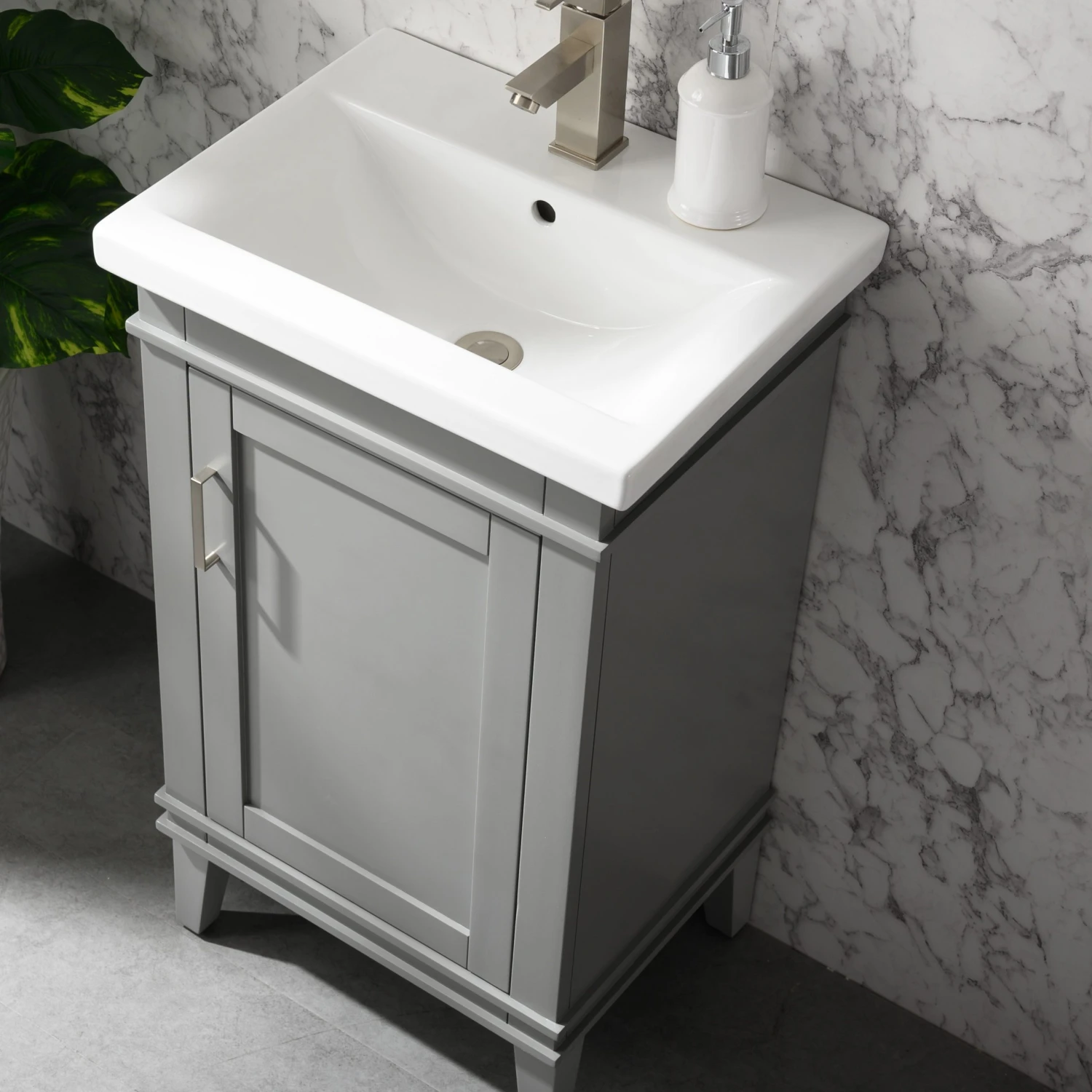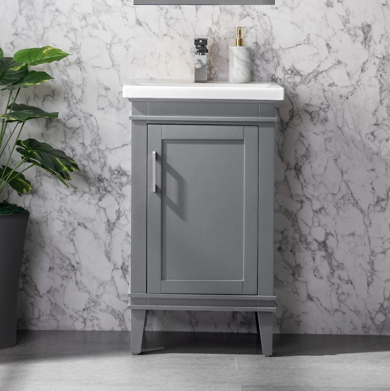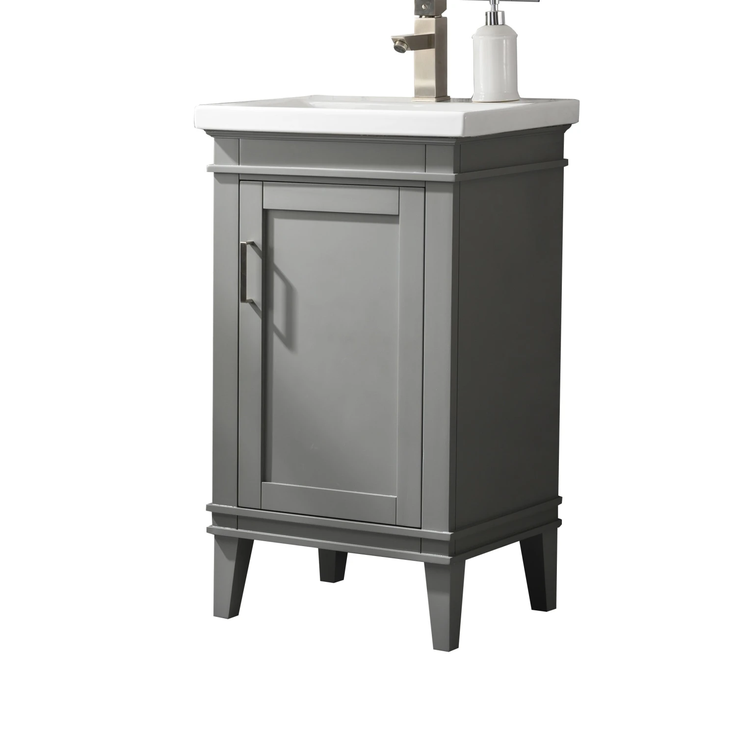 - Elevate your bathroom with style and functionality with this modern minimalist designed single bathroom vanity set. It has a solid construction with soft-close door. Topping off the design is a European inspired integrated porcelain sink and countertop combination with pre-drilled single faucet hole. This bathroom vanity comes with the trendiest color combination to choose from. Fully assembled except for the 4 legs. Â