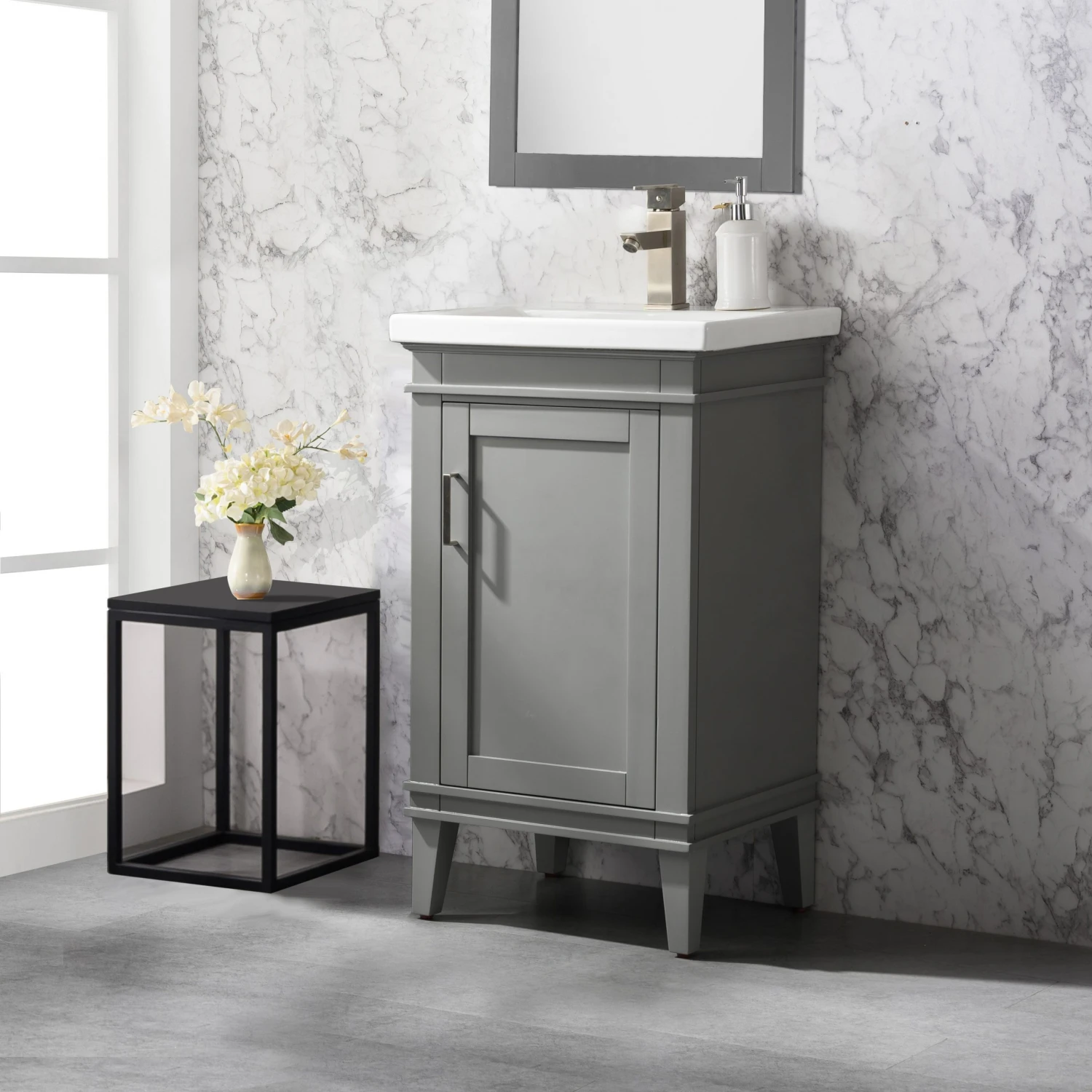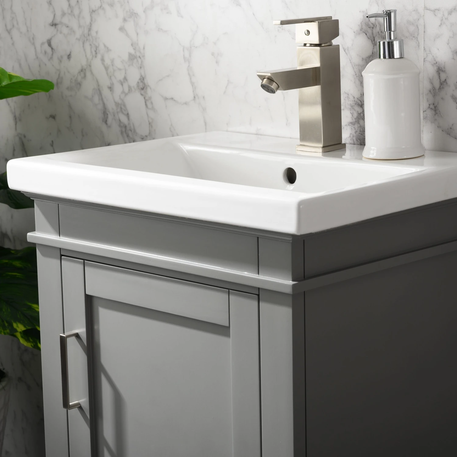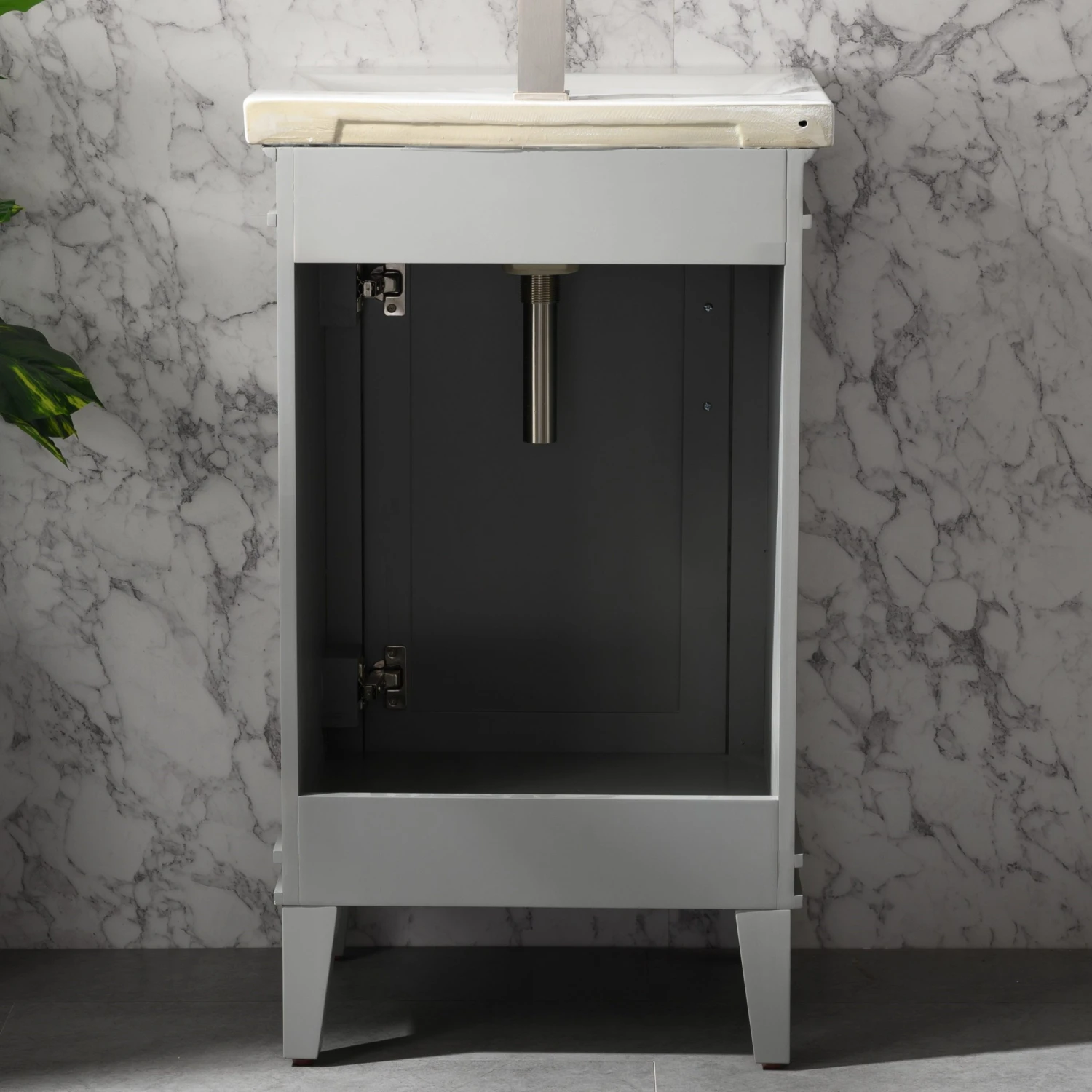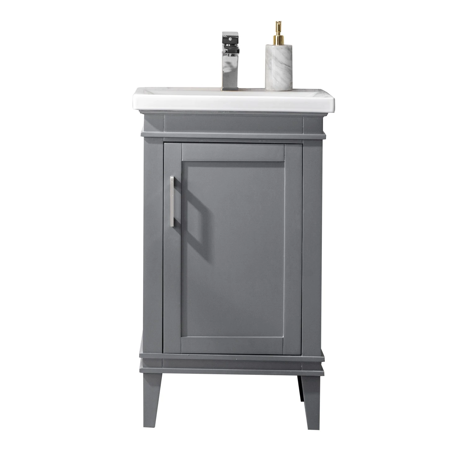 - Elevate your bathroom with style and functionality with this modern minimalist designed single bathroom vanity set. It has a solid construction with soft-close door. Topping off the design is a European inspired integrated porcelain sink and countertop combination with pre-drilled single faucet hole. This bathroom vanity comes with the trendiest color combination to choose from. Fully assembled except for the 4 legs. Â