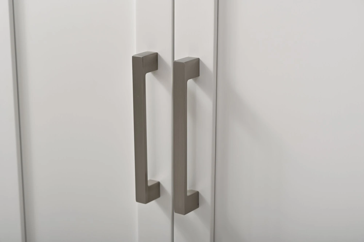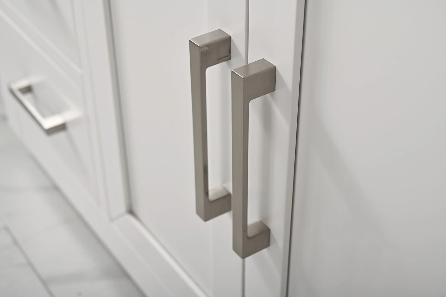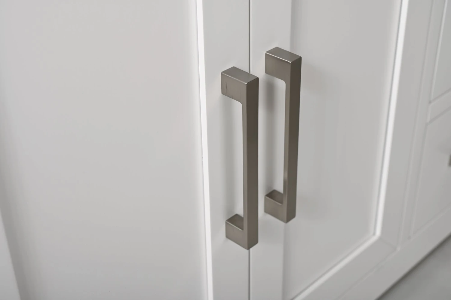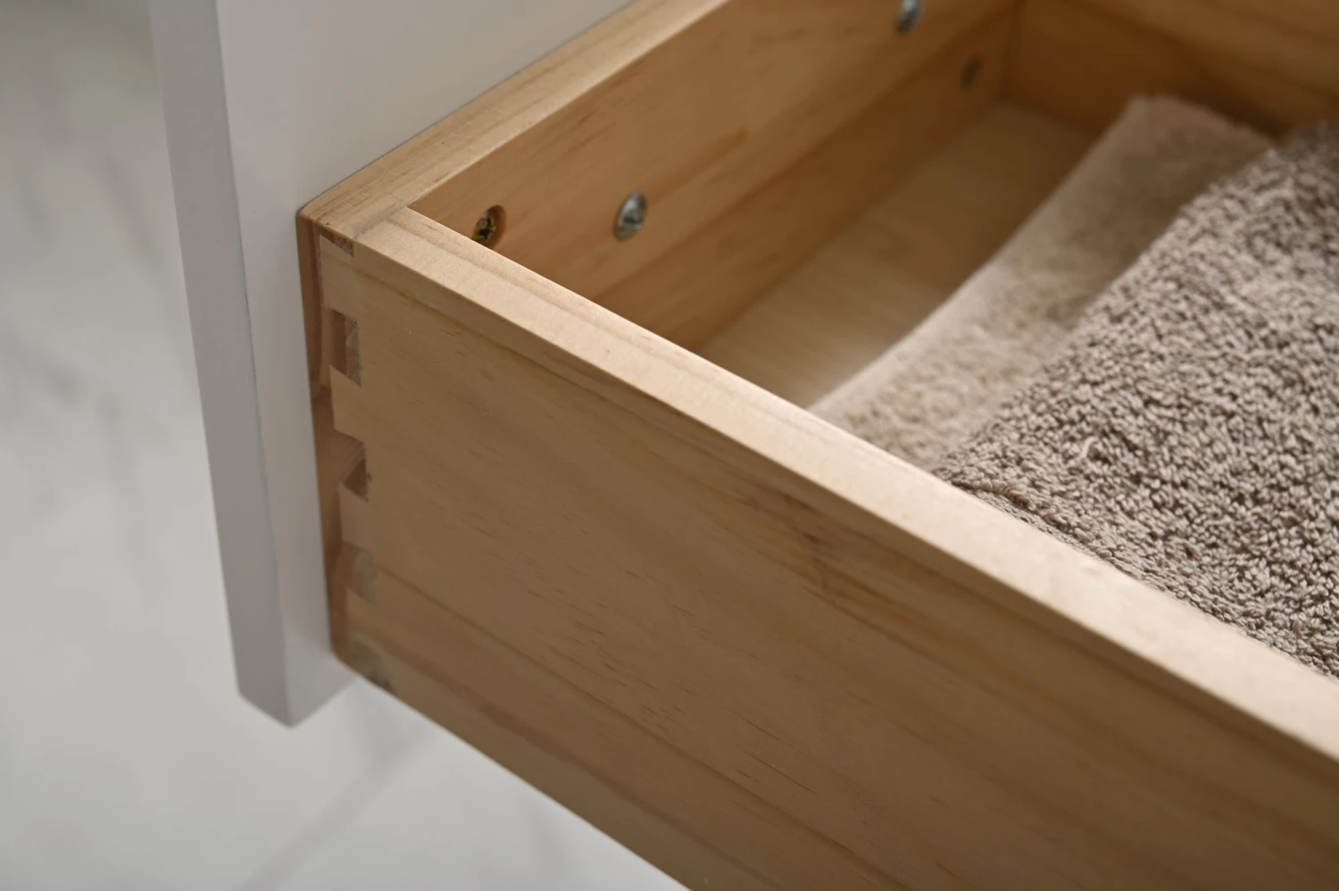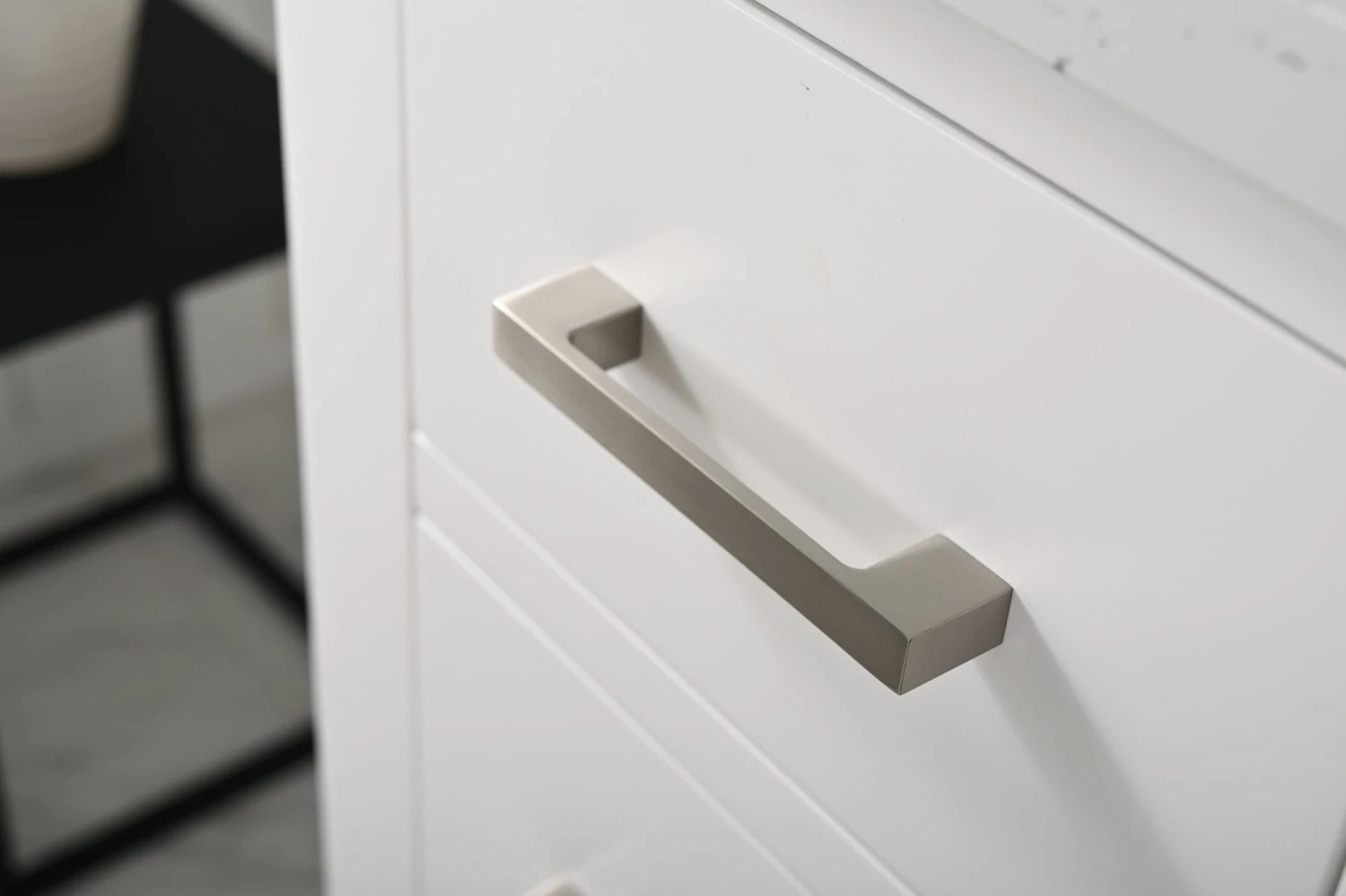 - The Grace Bathroom Vanity Collection was inspired by the 1950’s era minimalist design that captures clean lines, crisp geometry and contrasting use of mix material and color pertaining to that period. Premium quality construction detailed with a rich White color meticulously handcrafted and hand finished. Designed with a Plinth Base that creates an illusion of a floating effect. Features brushed stainless steel hardware, dovetail joints and many higher-end options. Available in 42”, 48” and 60”