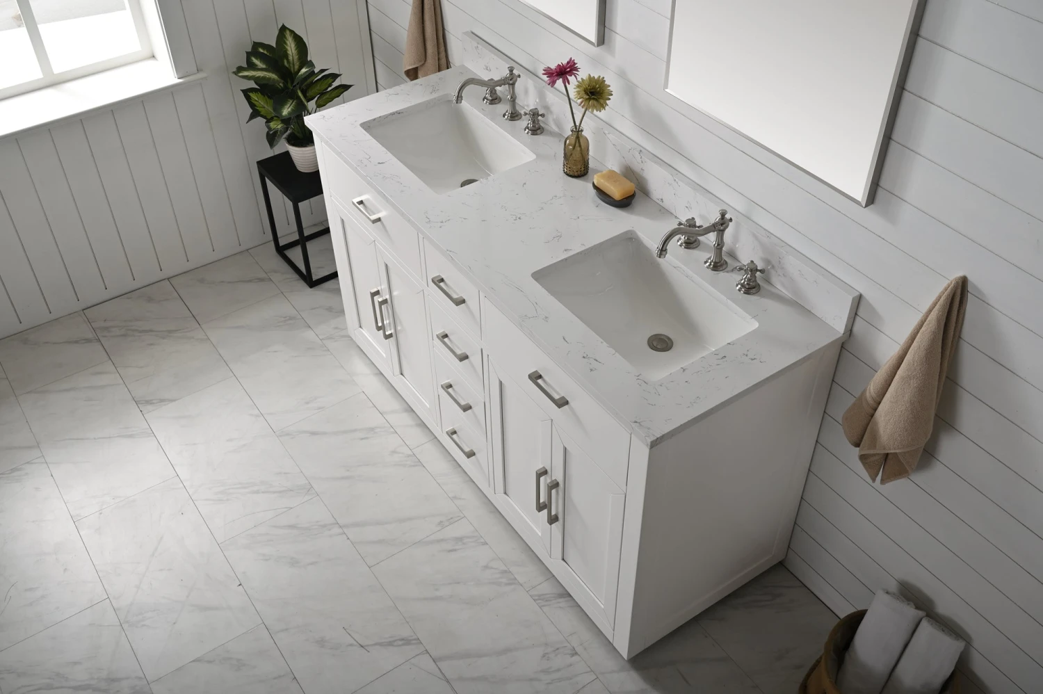 - Carrara White Quartz countertop with matching backsplash and under-mount sink.